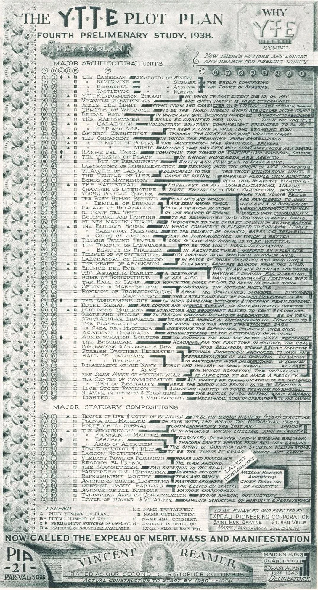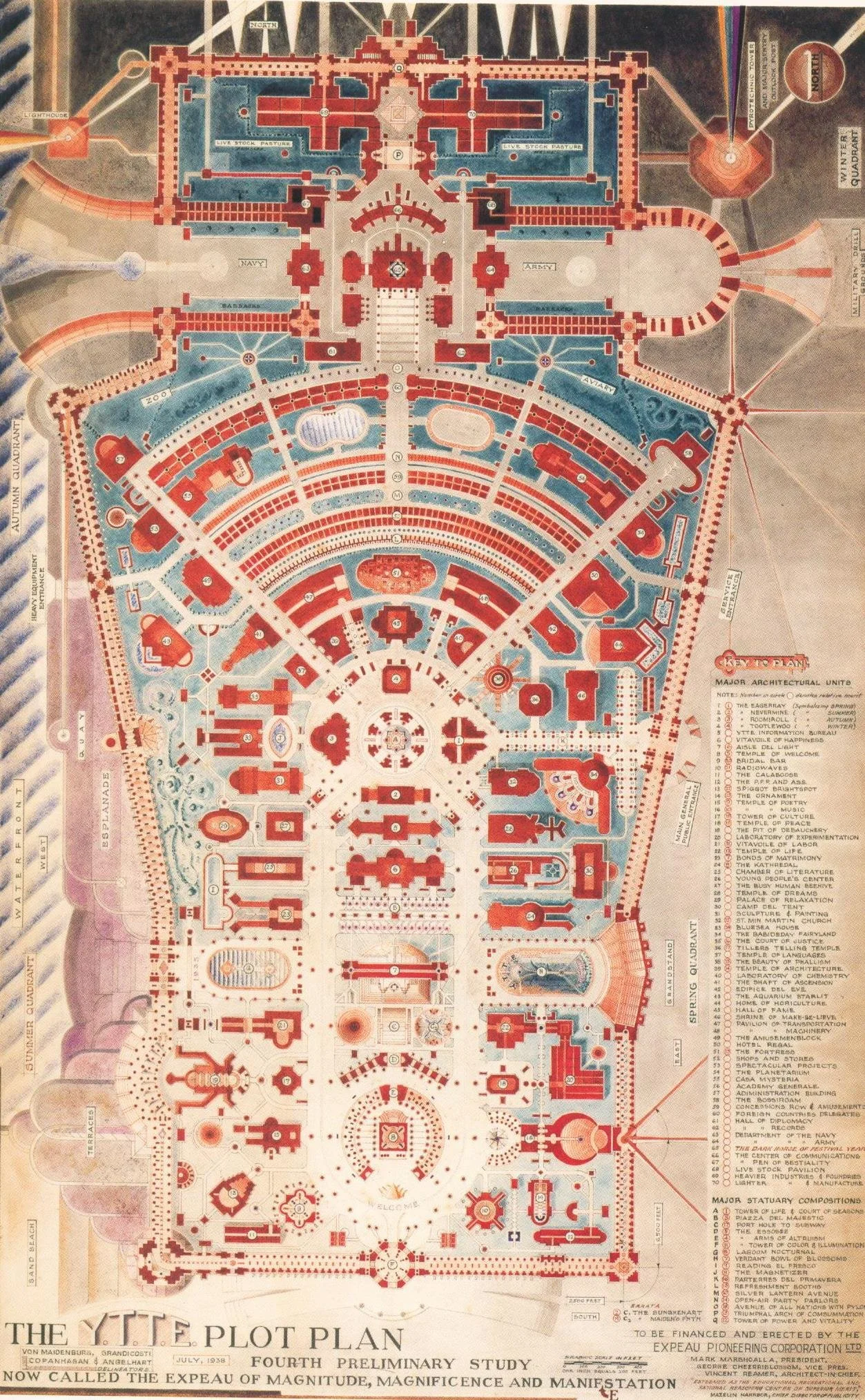 The plot plan of the Y.T.T.E. bears an unspoken resemblance to the floor plan of a cathedral. The central body of the plan is blocked into pew-like structures and veined with esplanades like aisles through a nave; arm-like transepts jut out either side, and at the head of the plan is an apse-like arch, contained within a cortex of bulging chevets. The plot plan was designed to bring a perfect city into being, but it was also a plan of a prototype of a plan; that is, a plan for an imaginary world’s fair.