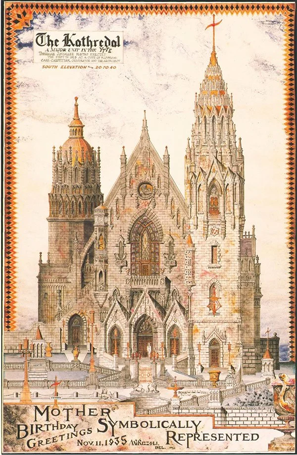 When the rest of his siblings had either married or fled, Rizzoli and Emma moved into a house in Bernal Heights, 1668 Alabama Street; here, he would live for the rest of his life, sleeping in a cot by the side of his mother’s bed. He would do a series of side jobs, working on the manuscript of The Colonnade until, in 1935, securing a position at Otto Deichmann’s architecture firm, where he would stay for almost four decades. That year, he handed his mother a birthday card. “The Kathredal: Mother Symbolically Represented”. It was his mother in the form of a Gothic Cathedral. Robust ogivals and flying buttresses express composure and pulchritude, elaborate tracery denotes diligence and charm. It was the first “Major Unit of the Y.T.T.E.”. The foundation stone, the source from which life springs. Alpha and Omega, the beginning and the end.