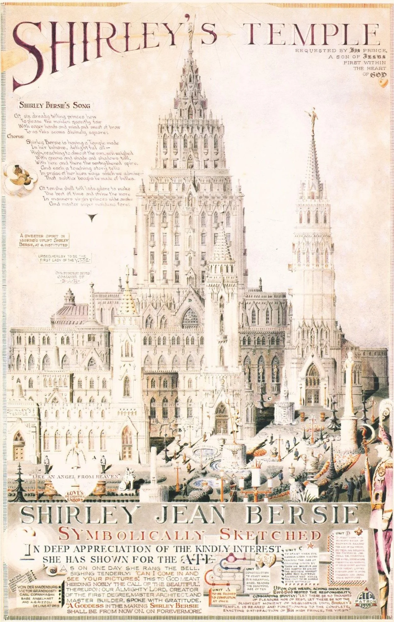 The Y.T.T.E. was not was not plucked from the air. It was built from bodies: the transmutation of bodies, beings who attained their ideal form as architectural expression. Thus was born a city, a community: “The Kathredal”, as its centerpiece – for architecture was the mother of the arts – and six-year-old Shirley, a neighbor, to serve as first lady and virginal hostess. Shirley’s Temple was the work of several month’s labor, a drawing almost as tall as the “young miss” herself, frilled with tiers and crocketed spires, each peaked with a finial of a tiny dancing figure. The postman is a Classical edifice – longitudinal and pilastered – Rizzoli’s colleague Gerry a steadfast water tower, and Mr Deichmann’s mother – progenitor of his earthly employer – a modernist skyscraper.